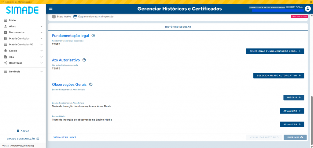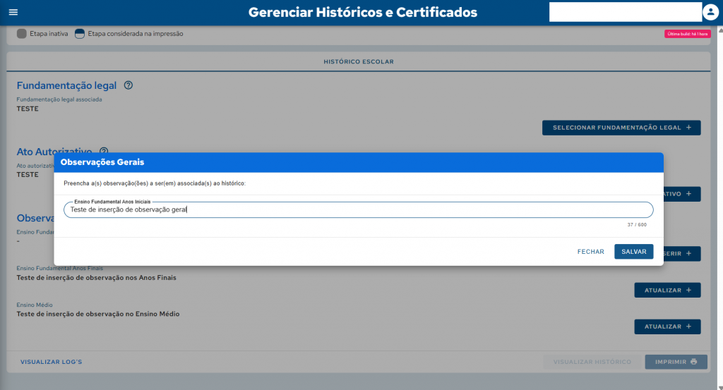- As Observações Gerais são impressas no rodapé das páginas do histórico referentes a cada nível de ensino (as páginas de níveis).
